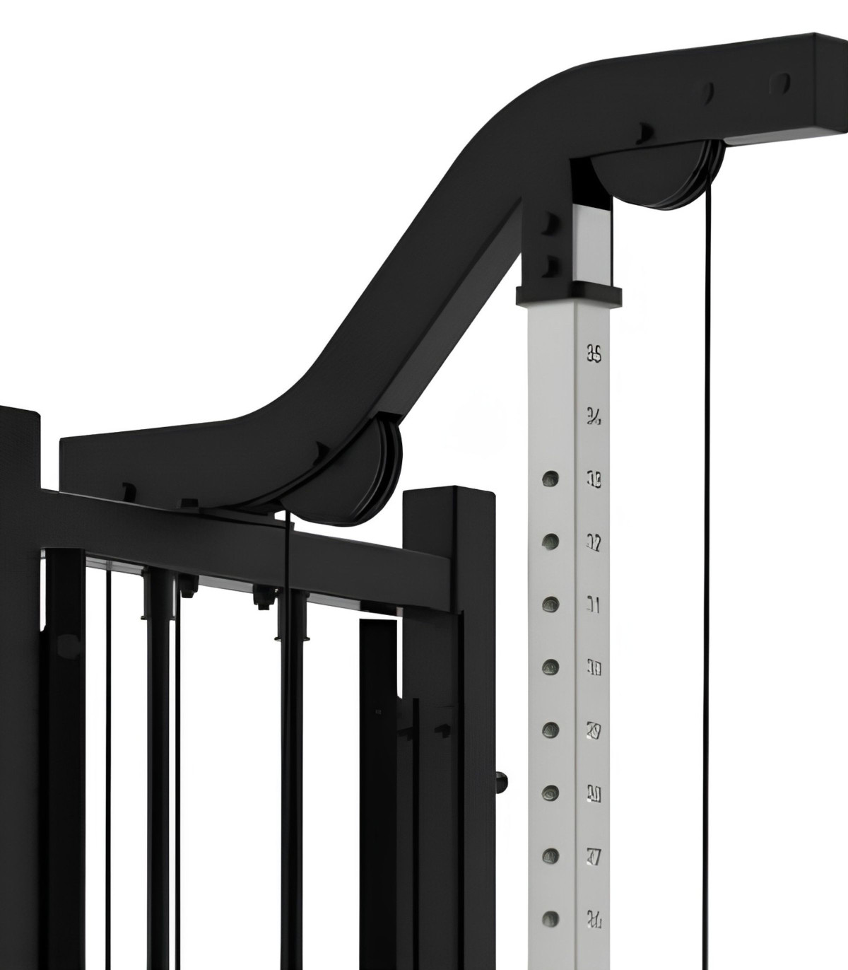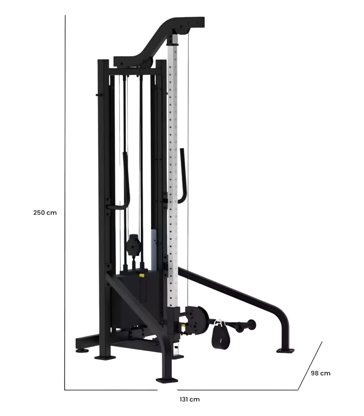 Cette unité de musculation verticale haut de gamme présente un châssis massif en acier renforcé assurant une stabilité totale lors des séances à forte intensité. Sa structure imposante garantit un ancrage au sol parfait même lors de sollicitations extrêmes pour le travail des pectoraux et du grand dorsal. Les dimensions de 114,9 cm x 125,8 cm x 233,8 cm permettent une intégration efficace en optimisant l'espace vertical sans compromis sur l'amplitude biomécanique. La transmission par câbles haute résistance gainés et poulies en nylon à roulements à billes fluidifie chaque répétition pour un travail d'isolation pur sur les biceps et les triceps. La colonne de poids offre une résistance totale de 96 kg segmentée en plaques de 6 kg permettant une surcharge progressive constante de la force. Cette station supporte une utilisation intensive tout en maintenant une intégrité structurelle irréprochable pour le recrutement des muscles stabilisateurs.