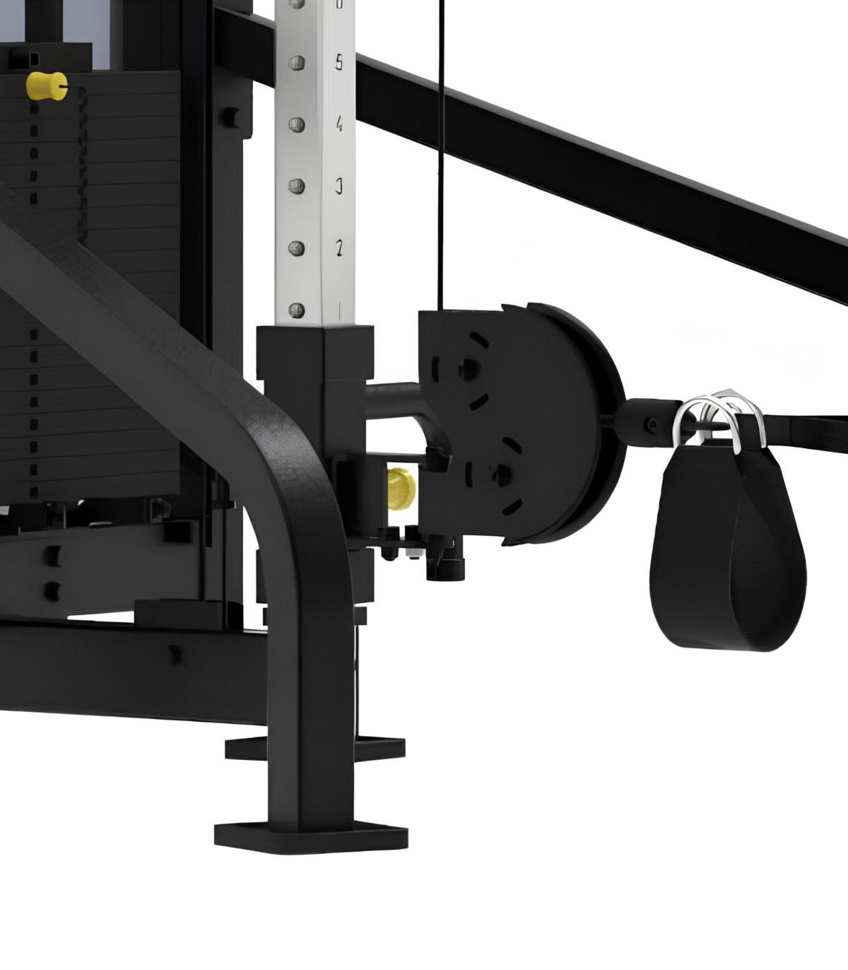 Cette poulie est équipée d'un mousqueton standard permettant l'utilisation de cordes à triceps, barres de tirage dos, poignées simples ou sangles de cheville pour les fessiers.