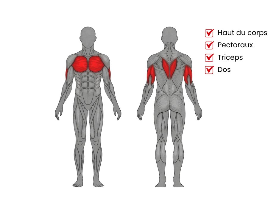 - Tonification du haut du corps : la presse de musculation mixte permet de faire à la fois un travail d’isolation en sollicitant principalement les muscles des pectoraux lors de la position « butterfly », et d’engager d’autres groupes musculaires lors de la position inversée comme : les triceps et les deltoïdes postérieurs, pour un haut du corps tonique, dessiné, et bien équilibré. Si votre objectif est d’impliquer les muscles secondaires (biceps, deltoïdes antérieurs, muscles stabilisateurs, coiffe des rotateurs etc.) d’autres exercices plus spécifiques comme le rameur, le développé militaire, les pompes ou encore les presses à charge libre vous permettront de compléter votre séance.
