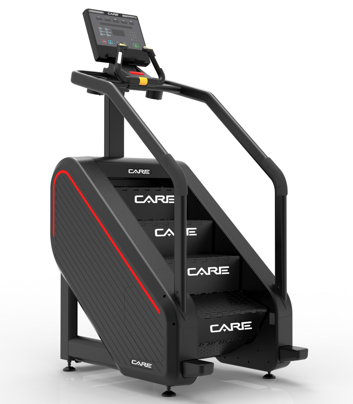 Le bouton d’arrêt d’urgence est relié à des capteurs infrarouges positionnés à la base des marches. Ceux-ci détectent automatiquement si l’utilisateur descend trop bas pendant l’utilisation et interrompent aussitôt le mouvement pour assurer une sécurité maximale. De plus, un frein automatique s’active dès que la machine est à l’arrêt, bloquant tout mouvement libre et garantissant une parfaite stabilité entre deux entraînements.