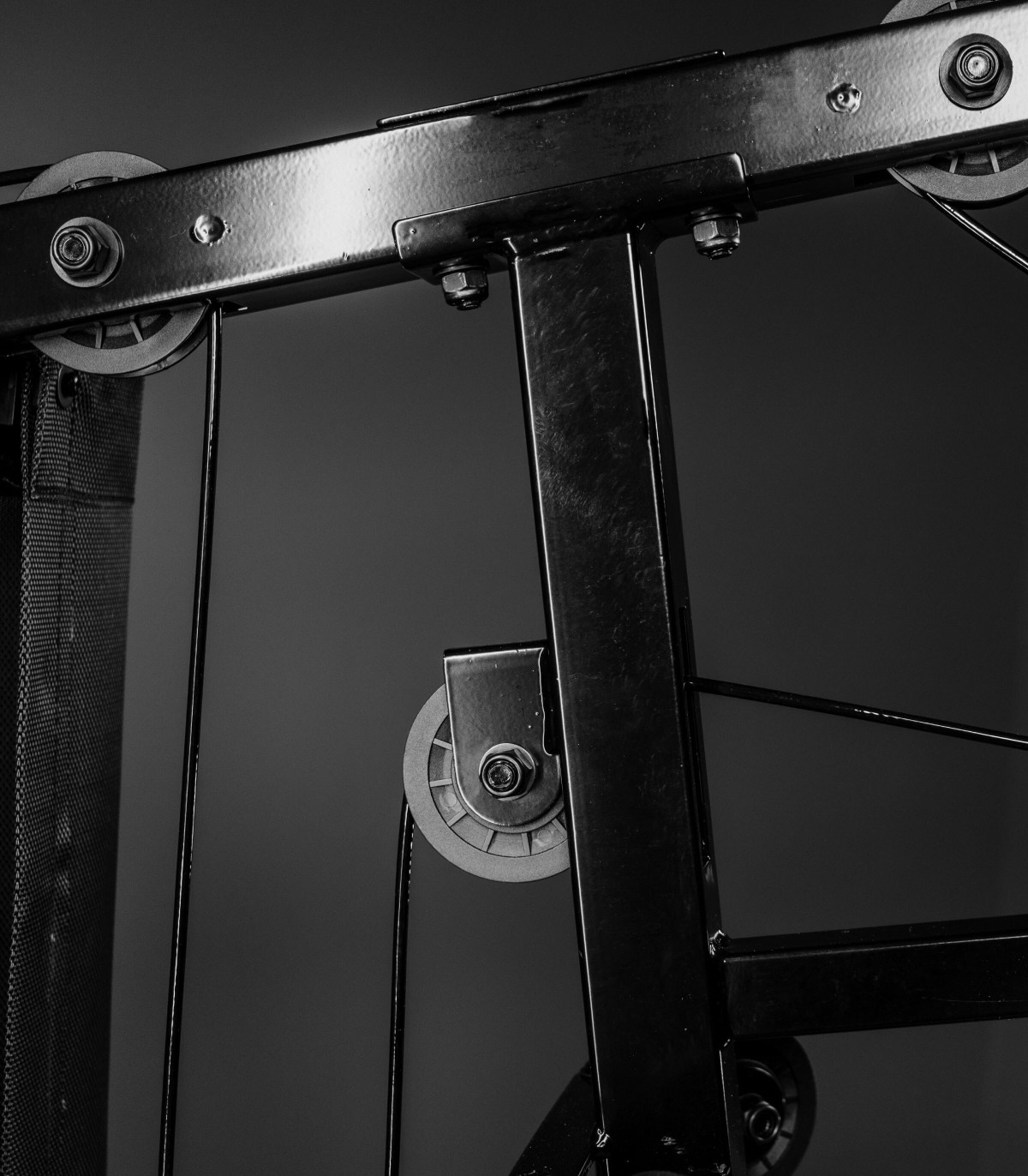 - Structure en acier renforcé et système de transmission par poulies pour un mouvement fluide, silencieux et sans à-coup.