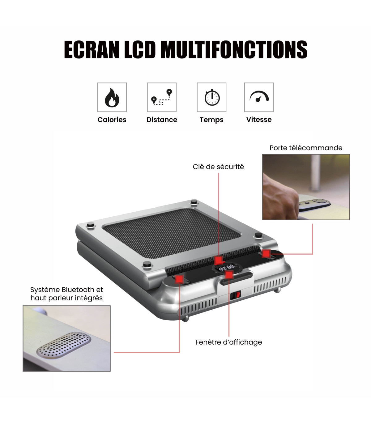 - Vitesse allant de 0.8 à 6 km/h, idéal pour la marche et la marche rapide