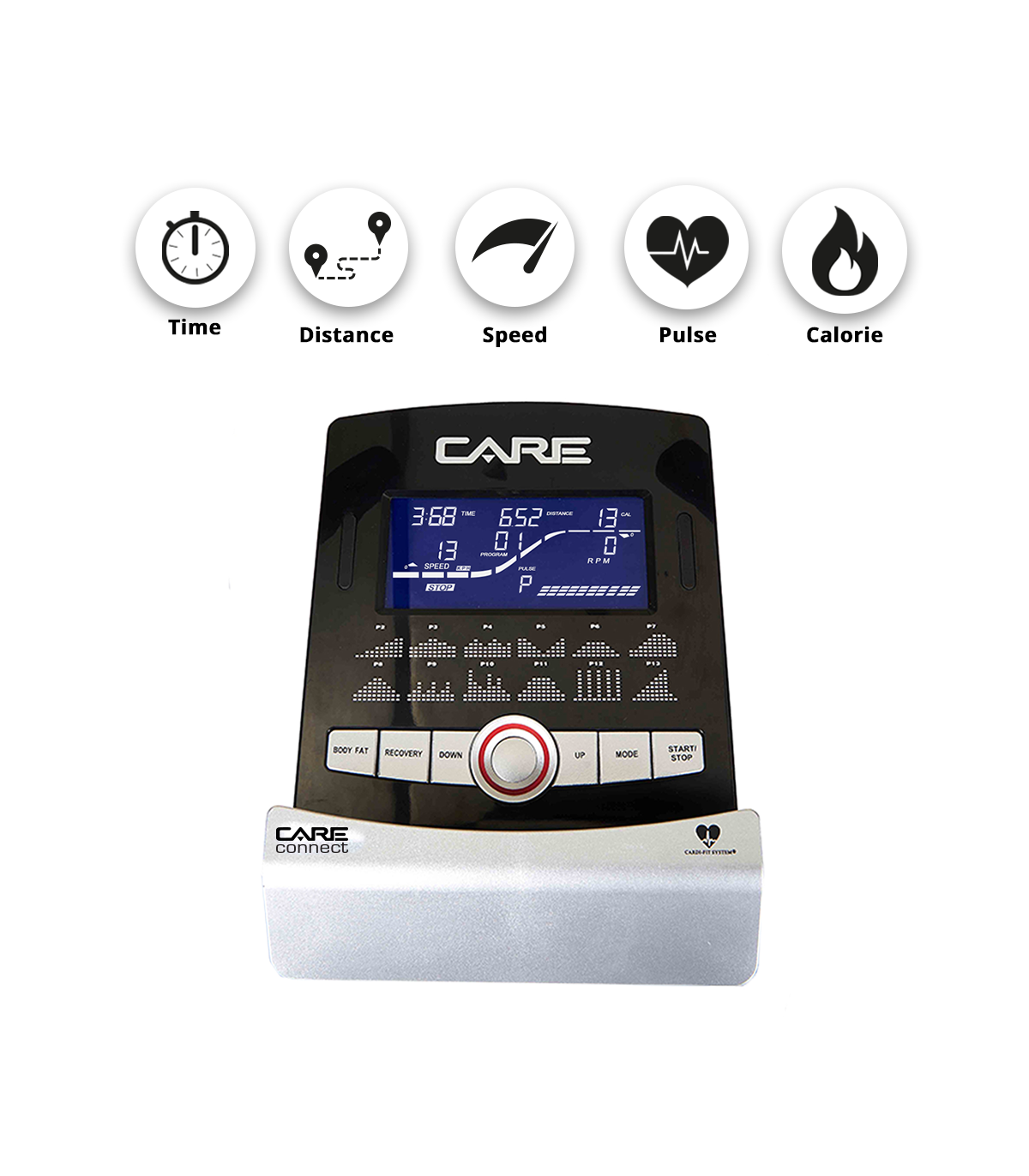 Le vélo CV-375 intègre dans sa console 11 fonctions en plus des nombreux programmes accessibles en quelques secondes, et une possibilité d'enregistrer jusqu'à 4 utilisateurs.